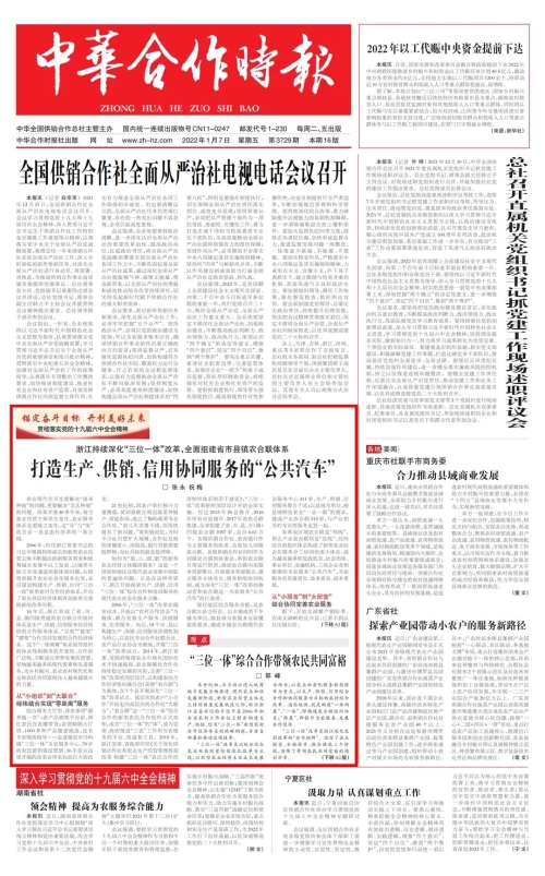 1月7日,《中华合作时报》第1版刊出省供销社党委书记、理事会主任邵峰署名文章《“三位一体”综合合作带领农民共同富裕》。并配发浙江持续深化“三位一体”改革长篇报道《打造生产、供销、信用协同服务的“公共汽车”》。
