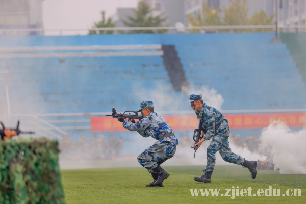 军事技能综合展示在激昂的音乐中震撼上演。团体操方阵依次摆出“喜迎二十大”“奋进征程”等字样,用青春告白祖国。擒敌拳方阵拳拳生风,势如猛虎;棍术方阵身棍合一,行云流水;旗语方阵挥舞青春,激情梦想;女生捕俘刀方阵铿锵有力,展现出巾帼不让须眉的强劲战斗力;战术方阵模拟实战演练,精彩演绎红蓝对抗。全体参演新生以意气风发的英姿,展现出经贸新青年团结、奋进、进取的风貌!