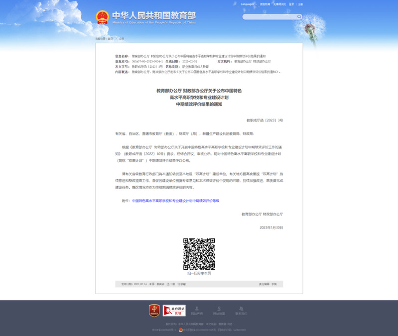 日前,教育部公布中国特色高水平高职学校和专业建设计划(简称“双高计划”)中期绩效评价结果,根据《教育部办公厅 财政部办公厅关于公布中国特色高水平高职学校和专业建设计划中期绩效评价结果的通知》(教职成厅函〔2023〕3号)要求,经综合评议、审核公示,确定了全国197所建设单位的评价等级,其中160所院校获得“优”等级,37所院校获得“良”等级。学校被认定为“优”等级,迎来2023年学校高质量发展“开门红”。