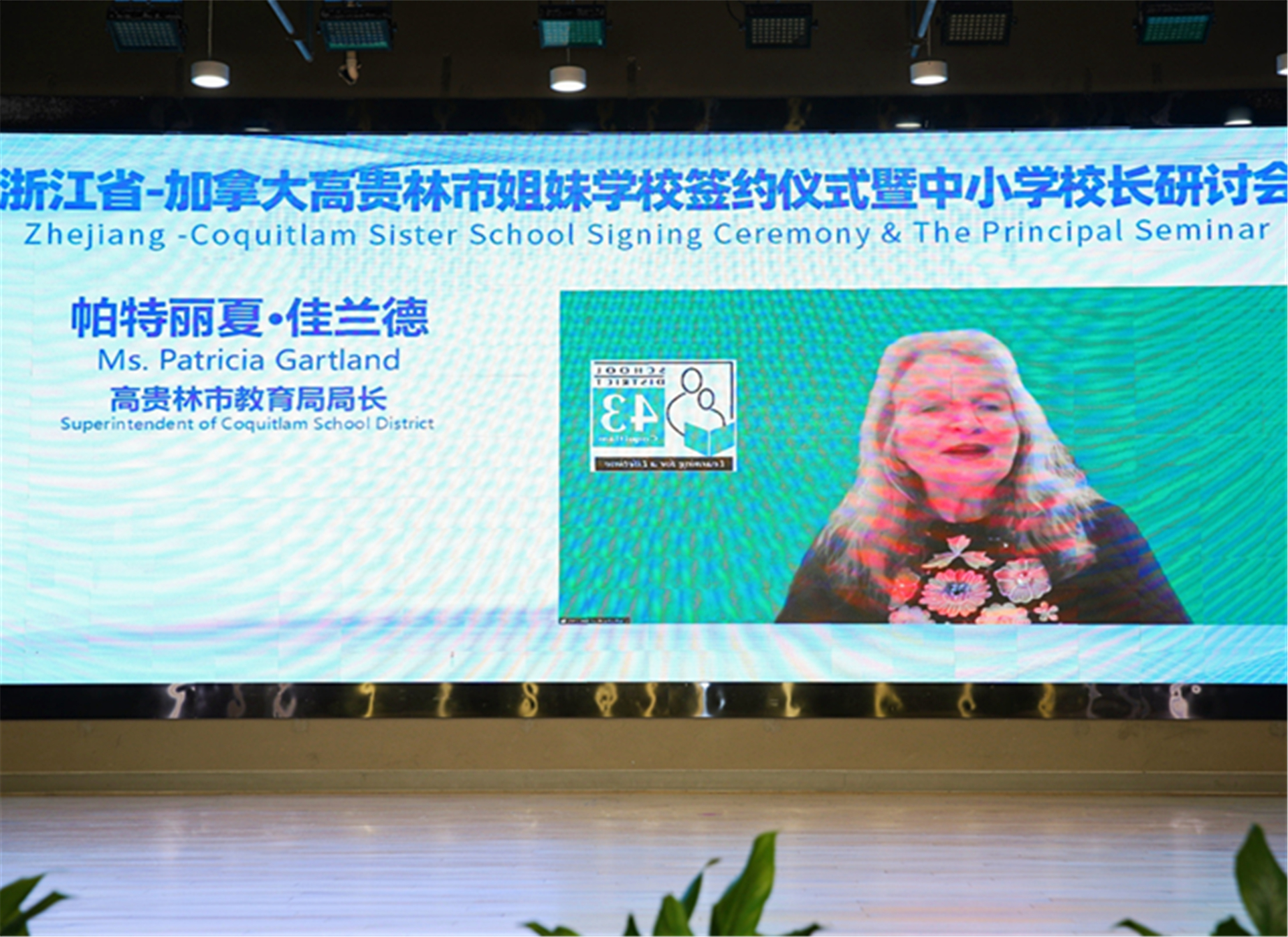 6月6日上午,浙江省-加拿大高贵林市姐妹学校签约仪式暨中小学校长研讨会以网络视频连线方式举行。活动由教育部中外语言交流合作中心指导,浙江省教育厅、加拿大高贵林市教育局主办,浙江省教育国际交流协会、杭州市上城区教育局、杭州市胜利小学承办。省教育厅总督学舒培冬出席活动并致辞,加拿大高贵林市教育局局长帕特丽夏·佳兰德、教育部中外语言交流合作中心副主任静炜线上出席活动并致辞。